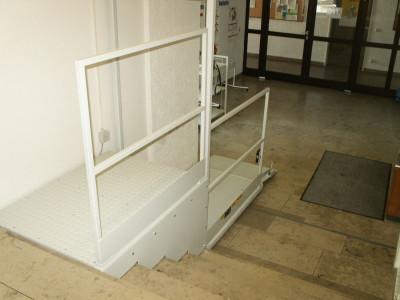 Flach-Hebebühne mit klappbarer Auffahrschräge und Treppenpodest in einer Agentur für Arbeit. |