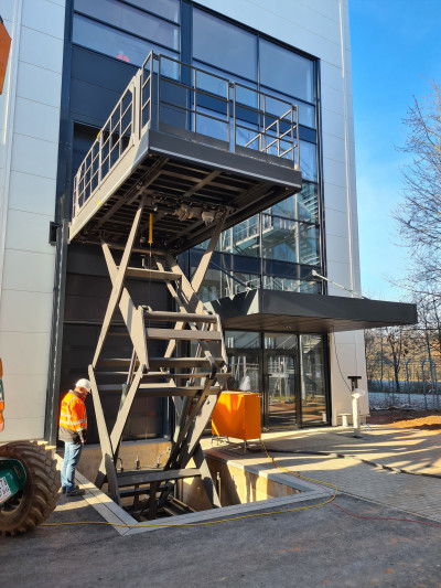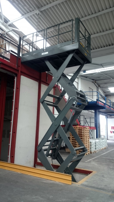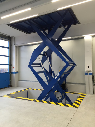 Hebebühne im Werkstattbereich zur Überbrückung einer Etage durch einen Deckendurchbruch hindurch. |