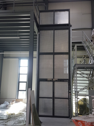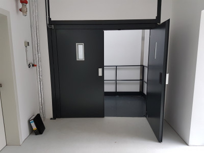 Hebebühne für Gütertransport in einem Schacht, mit Absturzsicherungen und Aufzug-Drehtür abgesichert. |