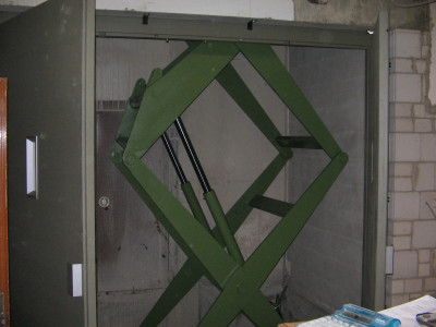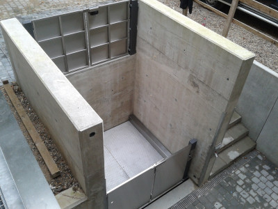 Hebebühne in einem Schacht montiert und mit verriegelter Drehtür abgesichert. |