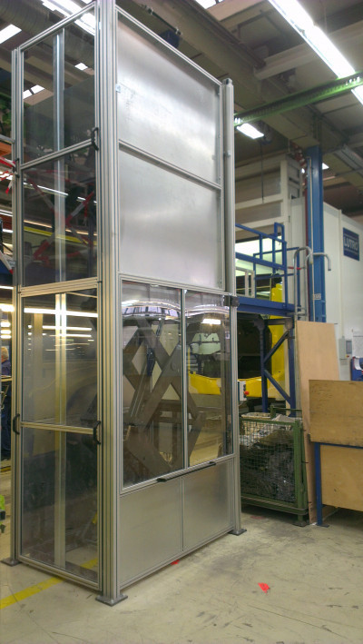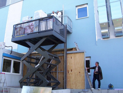 Dreifachscheren-Hebebühne für die Beschickung eines 2.Stockwerkes. Hebebühne incl. Sicherheitszubehöre wie elektromechanisch verriegelte Türen und Geländer |