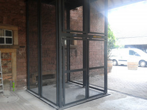 Hebebühne mit 3 gegenüberliegenden Haltestelle mit entsprechend verriegelten Türen. |