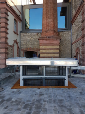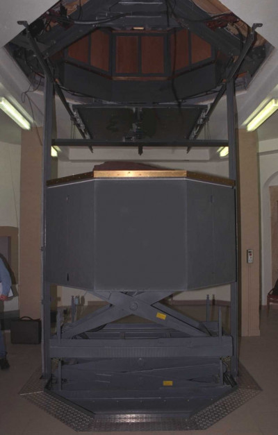 Hebebühne mit Bolzenverriegelung, durch eine Bodenöffnung wird ein Speisen gedeckter Tisch in das EG verfahren. |