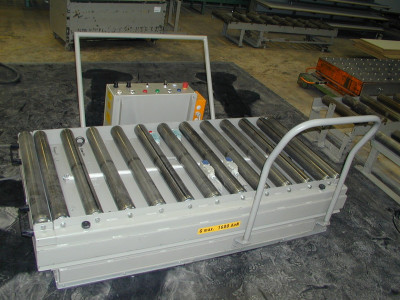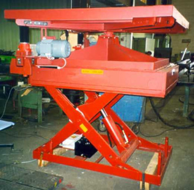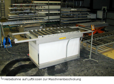 Hebebühne mit aufgebauter Rollenbahn auf Luftkissen zum leichtgängigen Verschieben, mit und ohne Last. |