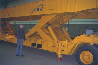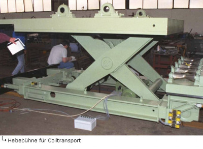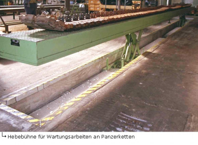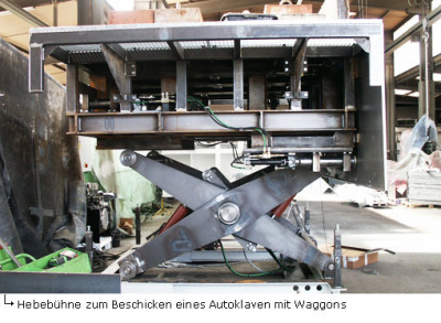 Hebebühne mit Bolzenverriegelung zu beschicken eines Autoklavs mittels Güterwaggon. |