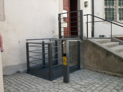 Hebebühnen mit Sonderausstattung zum Verfahren gehandicapter Personen im öffentlich zugänglichen Bereich. |